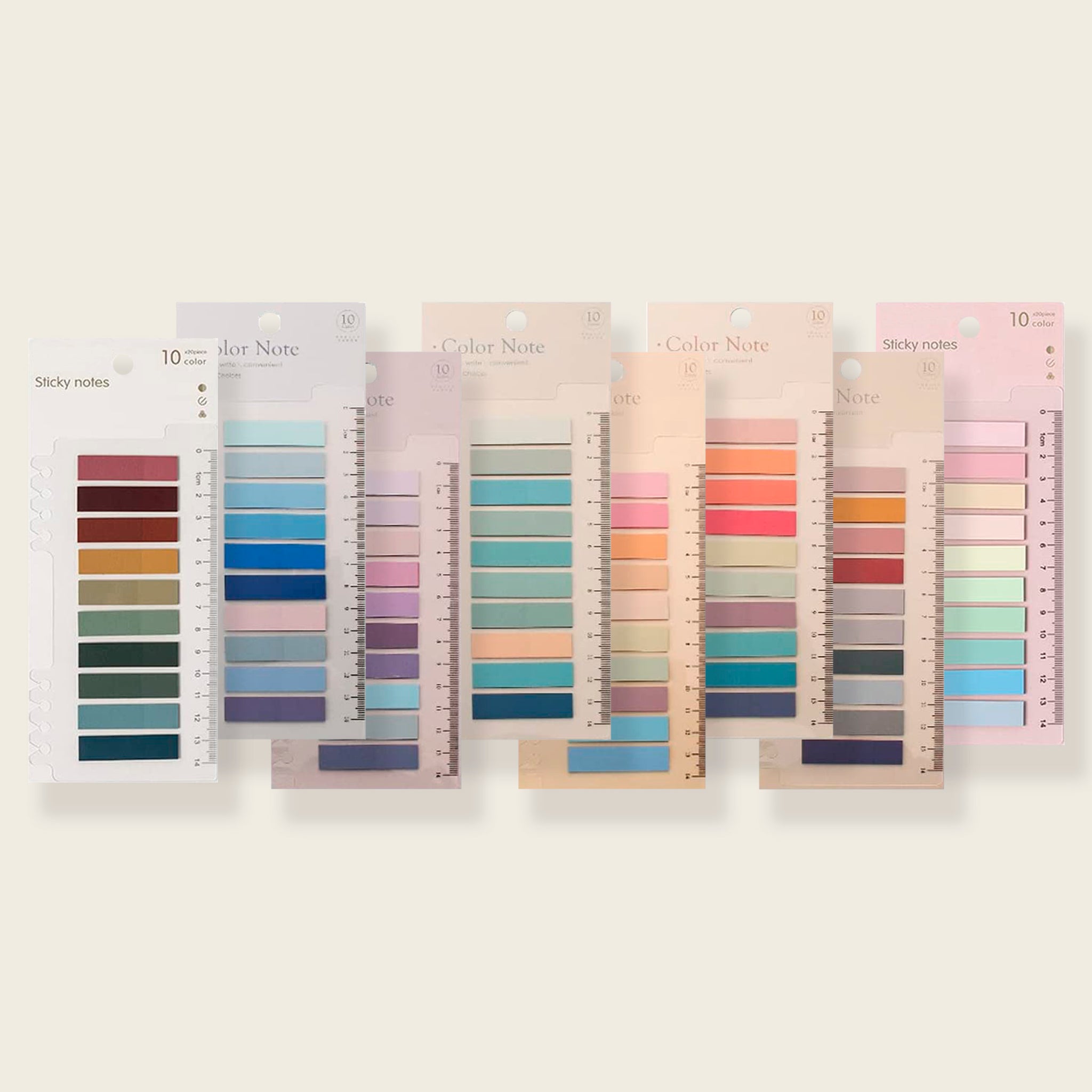 Jolis onglets adhésifs de 10 couleurs transparentes (avec règle) à utiliser comme marque-pages. Ils te permettront de planifier, d'organiser, de hiérarchiser et de personnaliser tous tes outils Soies, afin d'améliorer l'efficacité du travail!