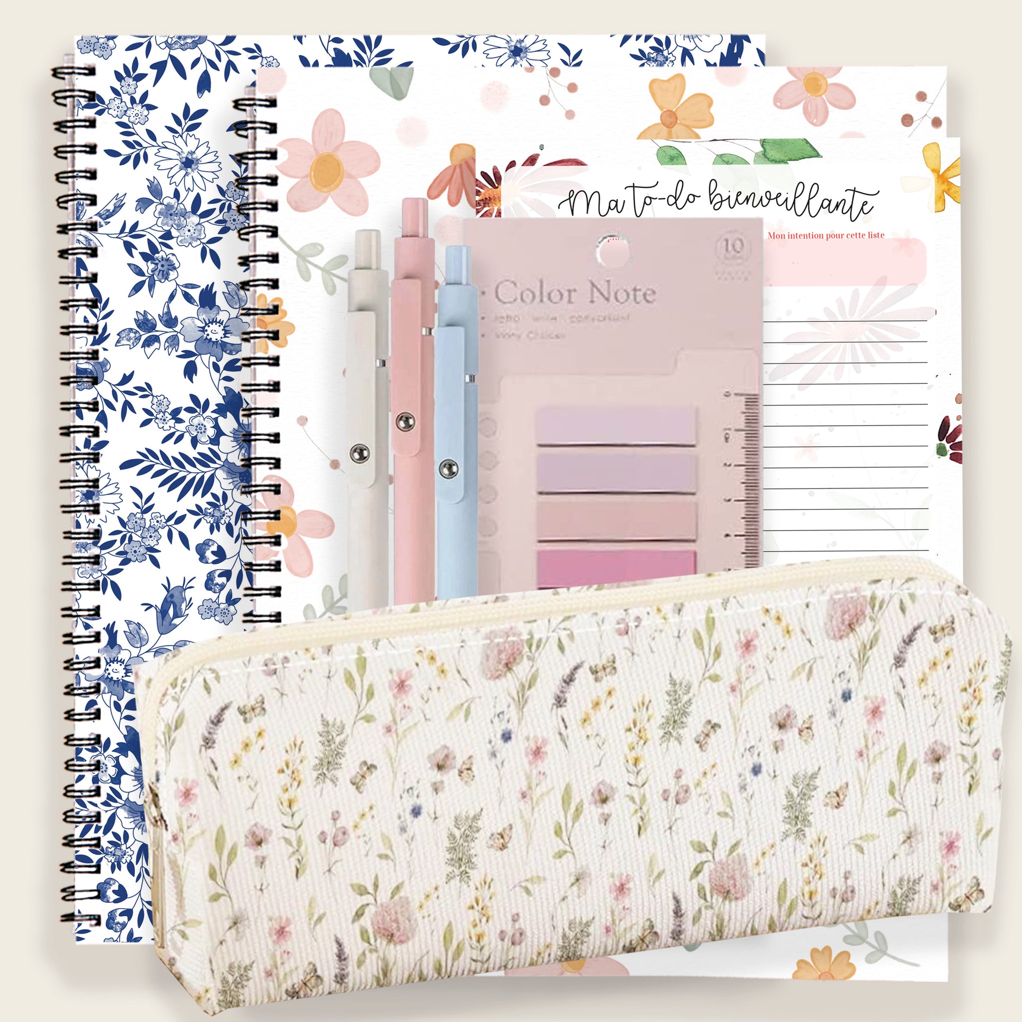 L'ensemble comprend un journal douceur, un grand carnet de notes, un bloc-notes to do bienveillante, 3 crayons de luxe, un étui à crayons et des onglets.