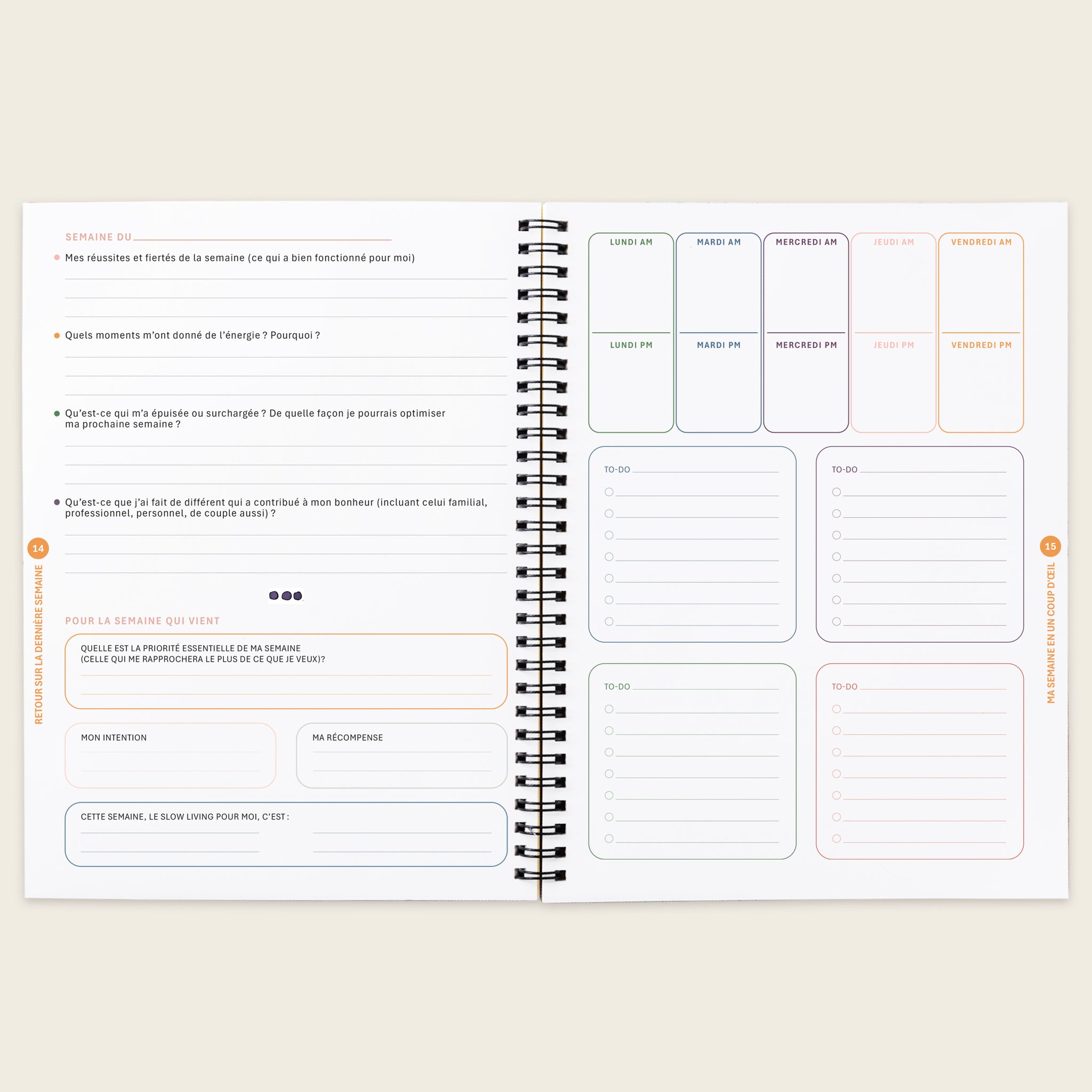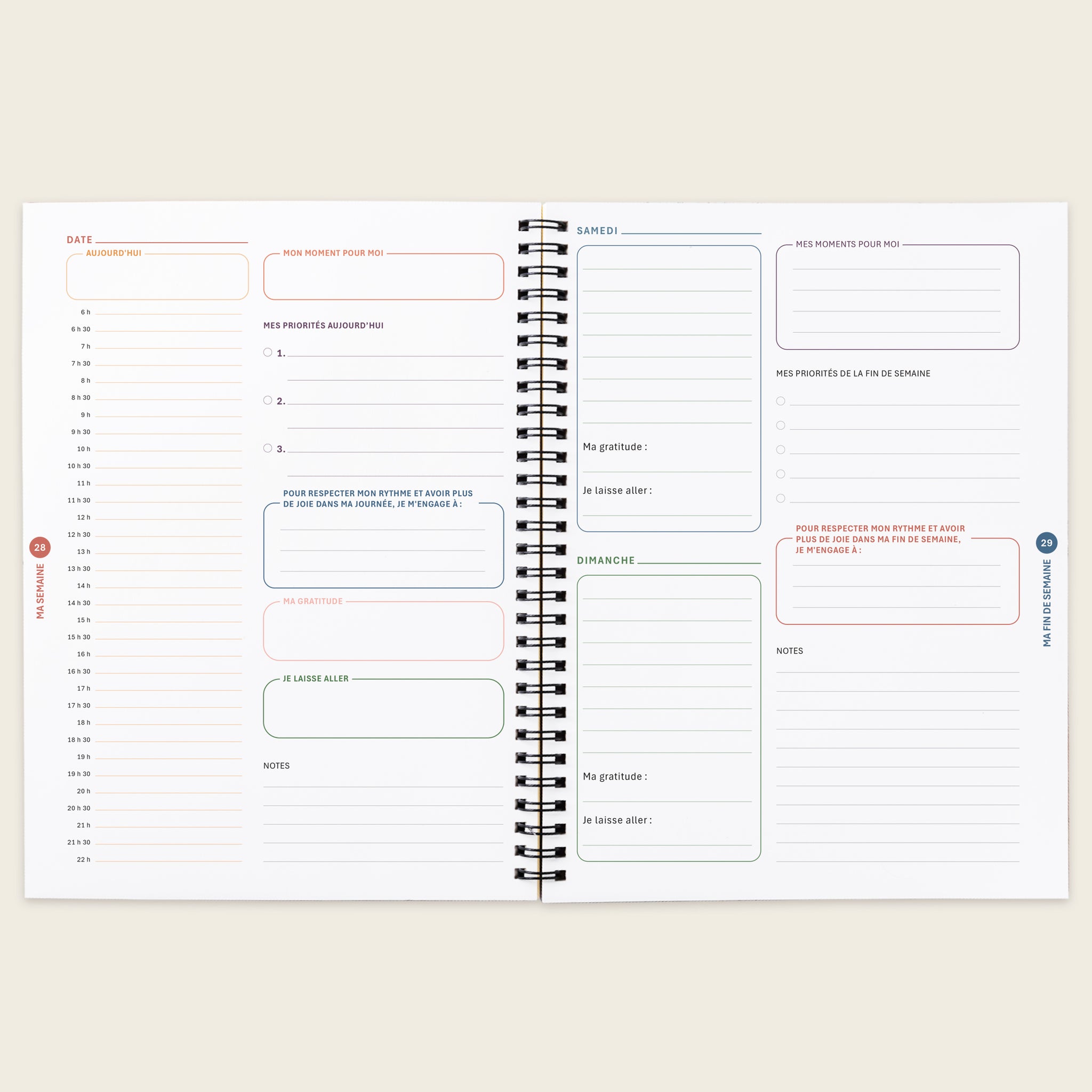 Le Journal douceur, c’est bien plus qu’un agenda. C’est un espace de recentrage, une invitation à respecter ton rythme et mieux gérer ton temps, semaine après semaine en t’offrant une structure pour vivre avec intention et t’écouter réellement.